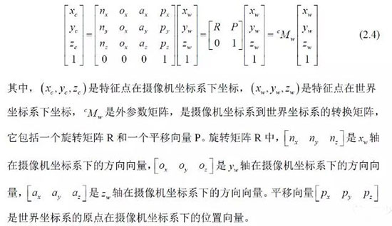 其中:(u,v)是特征点的图像坐标,(u0,v0) 光轴中心的图像坐标,(kx ky )是X 轴,Y 轴方向的放大系数,(xc yc zc) 是特征点在摄像机坐标系下坐标, Mc 是摄像机内参数矩阵。