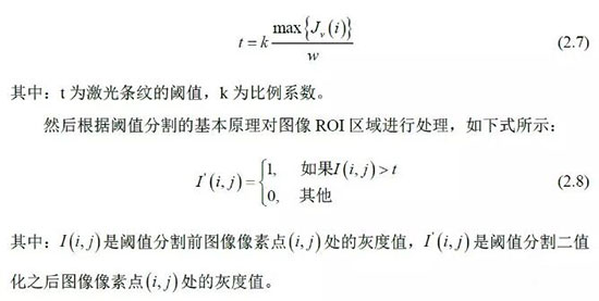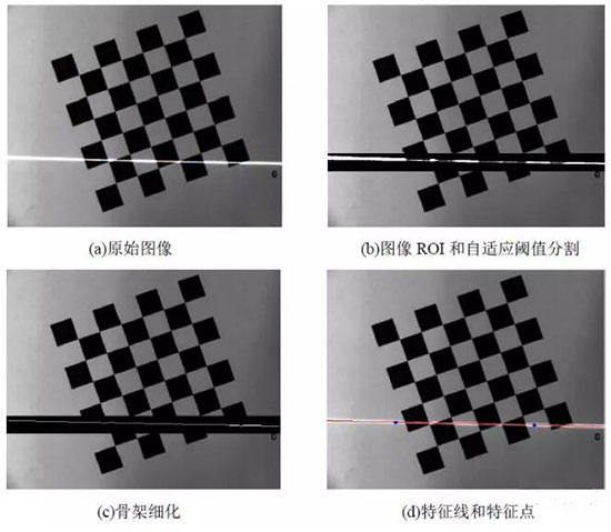 图像处理的目的是提取激光条纹上特征点的图像坐标。分为图像感兴趣区域(ROI)确定、自适应阈值分割、骨架细化和特征点计算。