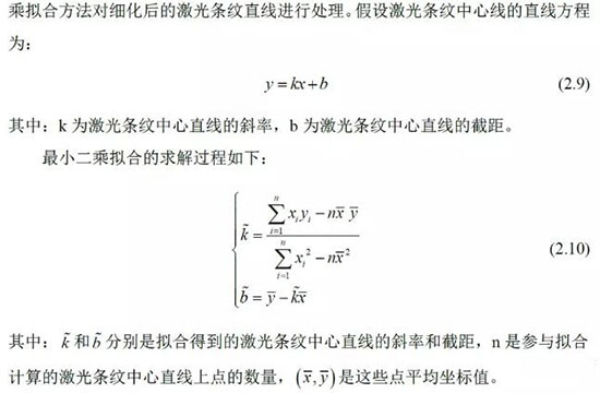 选取激光条纹中心线上的两个点作为激光条纹的特征点,为了提高激光条纹中心线的提取精度,利用最小二乘法拟合方法对细化后的激光条纹直线进行处理。