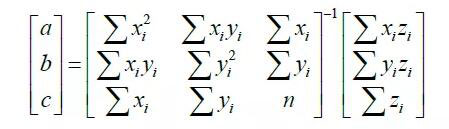 至此,得到四个激光条纹特征点的图像坐标,由上式得四个激光条纹特征点在摄像机坐标系下的坐标,由于三点确定一个平面方程,使用最小二乘法计算结构光平面方程如下: