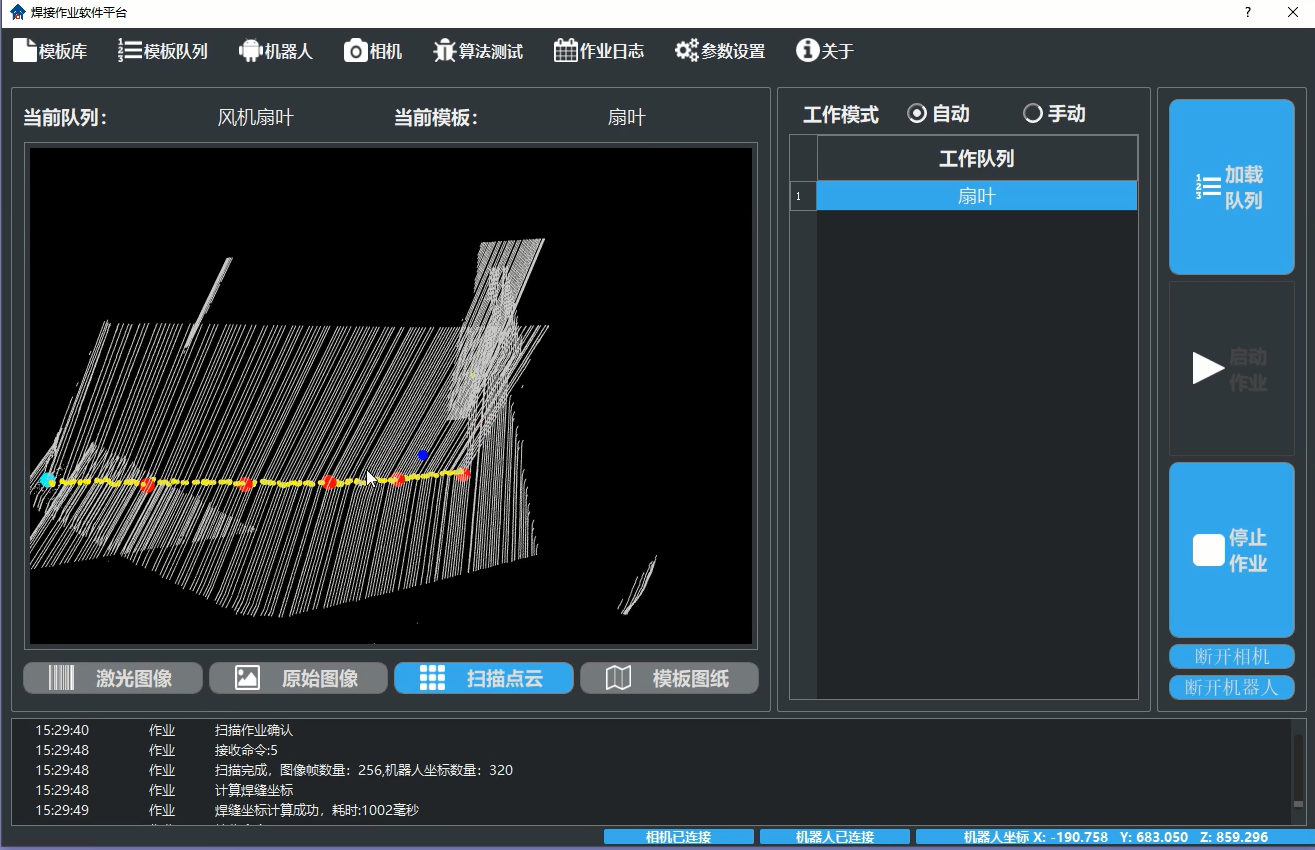 本系统主要用于(轴流-离心)风扇扇叶焊接所出的解决方案,相比之前使用寻位跟踪功能去焊接,焊接周期降低,不用考虑弧光的影响,示教调试时间减少,采用新的算法扫描,记录实时焊接状态数据,提供日志功能,可通过偏移实现两面焊接。